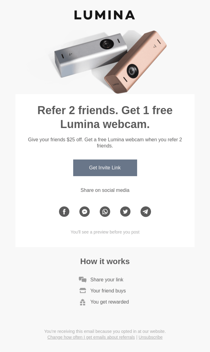 Webcam company Lumina sent this email to incentivize its current customers to invite their friends to purchase one of the company’s webcams. Every referred individual receives $25 off their purchase, while the referrer receives a free product as thanks after 2 friends complete their purchases. This referral program spreads goodwill with existing and new customers as both get rewarded for their participation.