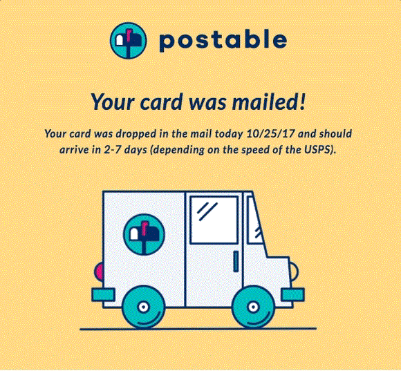 While you have less creative freedom with transactional emails, you can still use fun subject lines, eye-catching graphics, and lively language to let your brand shine through—like in this example from Postable, a designer greeting card company. This fun and colorful GIF illustrates that the customer’s order has been shipped and is on the way to the recipient.