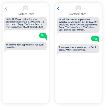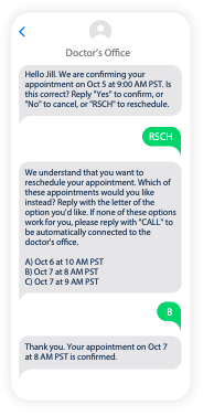 Here’s three scenarios of bidirectional appointment reminders sent to a patient via SMS: