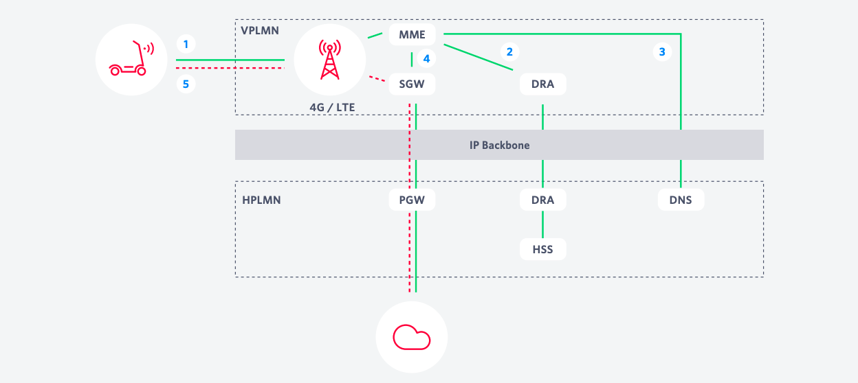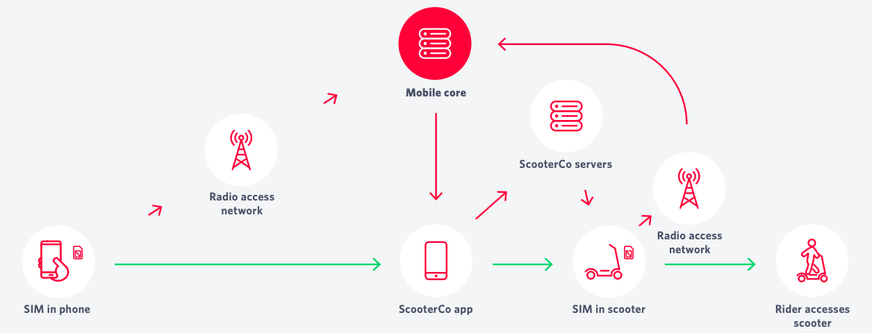 Imagine a fictional on-demand scooter company, ScooterCo, and the complex dance of interlocking systems that happens when a rider wants to unlock a scooter through the ScooterCo app. If the SIM in the rider’s phone is properly authenticated by the cellular data network’s mobile core, she’s allowed to access the internet, and the mobile core establishes a data connection between her app and ScooterCo’s servers which may be in another city – or another country. Then the core creates the path that data takes across the internet with routing algorithms. Once the rider’s username and password are confirmed by ScooterCo’s servers, and the rider’s chosen scooter is identified by the app, the app “asks’’ the ScooterCo server to unlock the scooter, which is also connected to the cellular data network – through its own SIM and thus identity on the network. Presuming all is in order, the ScooterCo server orders the rider’s chosen scooter to unlock and our rider is happily on her way. Because all of this happens within a few milliseconds, the rider’s experience is heavily dependent on the speed and reliability of this seemingly simple transaction. Figure 1 demonstrates this visually.
