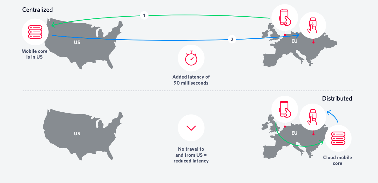 A Distributed IoT Mobile Core is a virtual, cloud-based, puresoftware mobile core that is architectured specifically for the needs of IoT devices, and deployed globally with regional internet breakouts. If you have a cellular IoT solution deployed in multiple countries, then you’re probably used to customizing device behavior based on the underlying network characteristics. With a Distributed IoT Mobile Core, you don’t have to do that anymore. This translates into lower operational overhead and a more seamless customer experience. IoT solutions demand performance and flexibility that traditional carrier mobile cores often cannot provide. Unlike mobile handsets and tablets, most IoT devices are autonomous and must be monitored and controlled by the connectivity provider. IoT devices intended for non-fixed use cases, such as the dockless scooters we discussed above, or devices deployed across several different countries or regions, must be able to attach to different cellular networks without human intervention. Let’s say you have an IoT solution with connected devices all over the world. Suppose you’re using a traditional carrier-owned core physically located in the US, and that core is serving an IoT device physically located in Germany. The round-trip latency would increase by 90 milliseconds. Now suppose that IoT device makes its way to Singapore; the roundtrip latency would increase by 245 milliseconds.This is a significant problem for mission-critical IoT solutions. Now imagine the same IoT solution, but in place of a US carrier, you use a Distributed IoT Mobile Core that is virtualized on a server in Germany and Singapore. The round-trip latency is greatly reduced. Suppose you had someone with a smart phone trying to call someone through a wearable device with voice calling enabled. Now consider a scenario where both devices are in Germany, but a centralized mobile core is in the United States. Figure 4 illustrates how a centralized versus a distributed mobile core orchestrating data impacts latency.